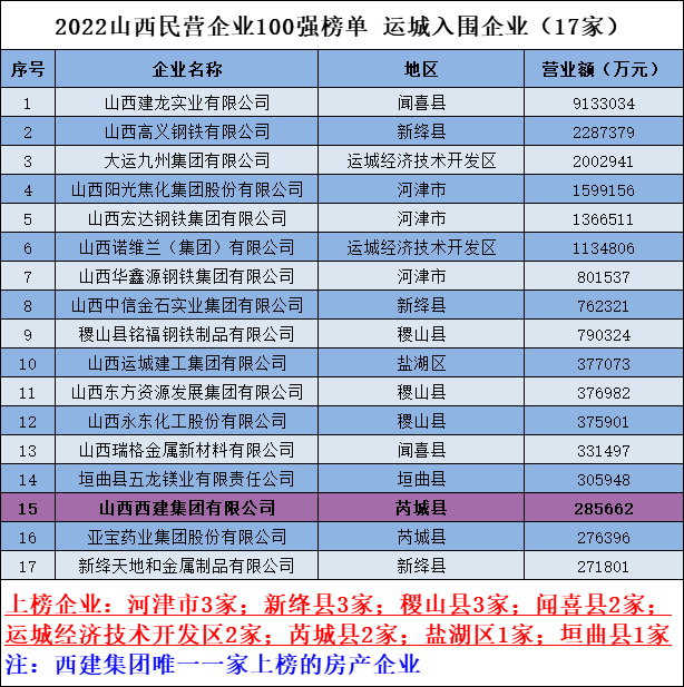 該榜單由山西省工商聯(lián)官方權(quán)威發(fā)布,以下為運(yùn)城市上榜企業(yè)名單:
