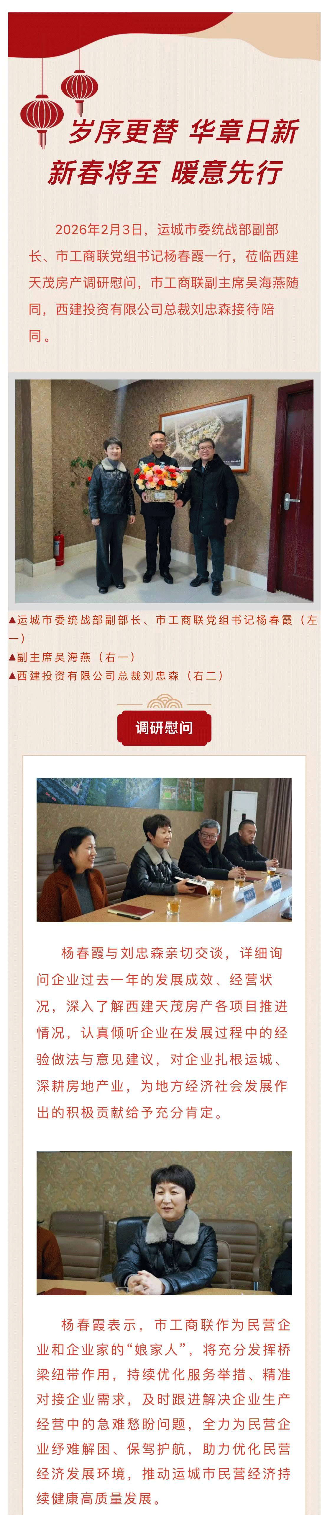 運(yùn)城市委統(tǒng)戰(zhàn)部副部長、市工商聯(lián)黨組書記楊春霞一行蒞臨西建天茂房產(chǎn)調(diào)研慰問